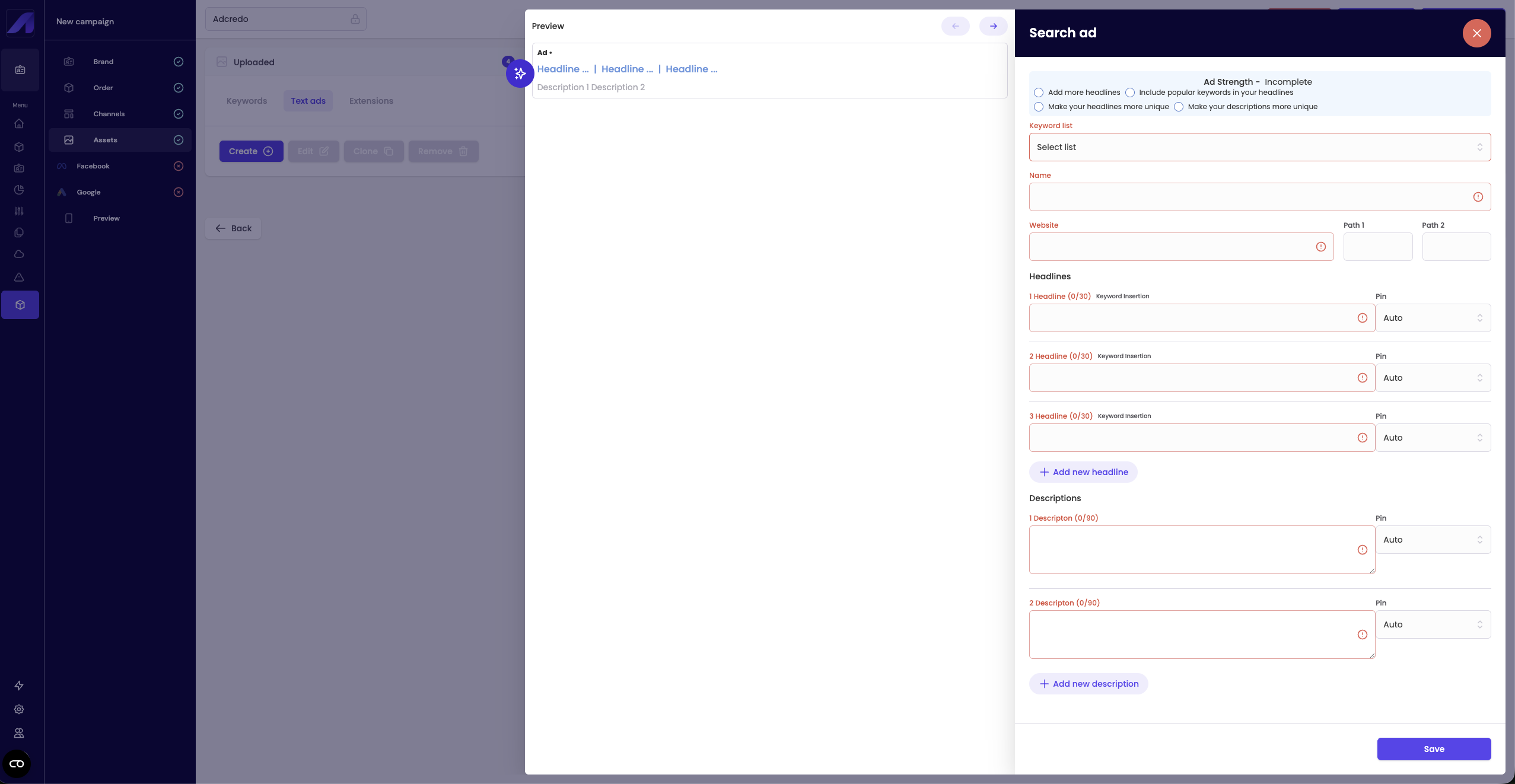 - Add headlines (3–15) and descriptions (2–4).