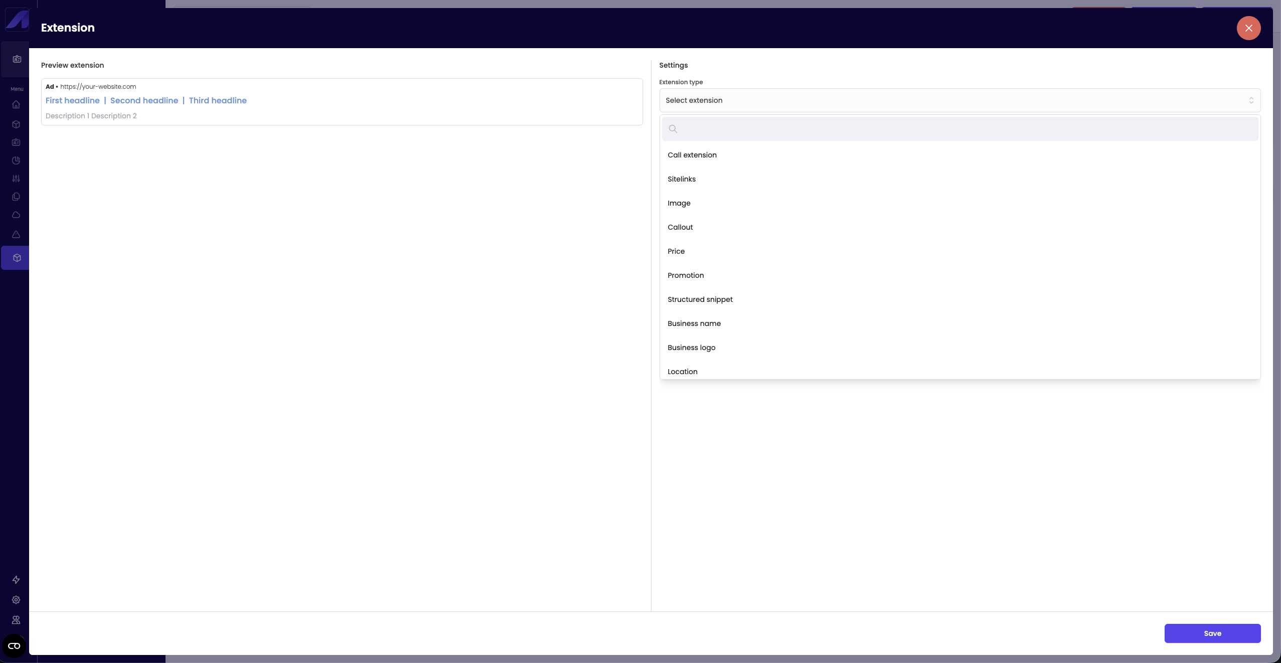 - Call asset, sitelink, image, callout, price, promotion, structured snippet, business name, business logo, location.