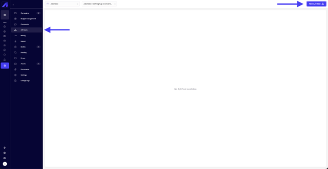 The A/B test section in an Order lets you create cross-channel A/B tests managed by Adcredo (separate from native platform experiments).