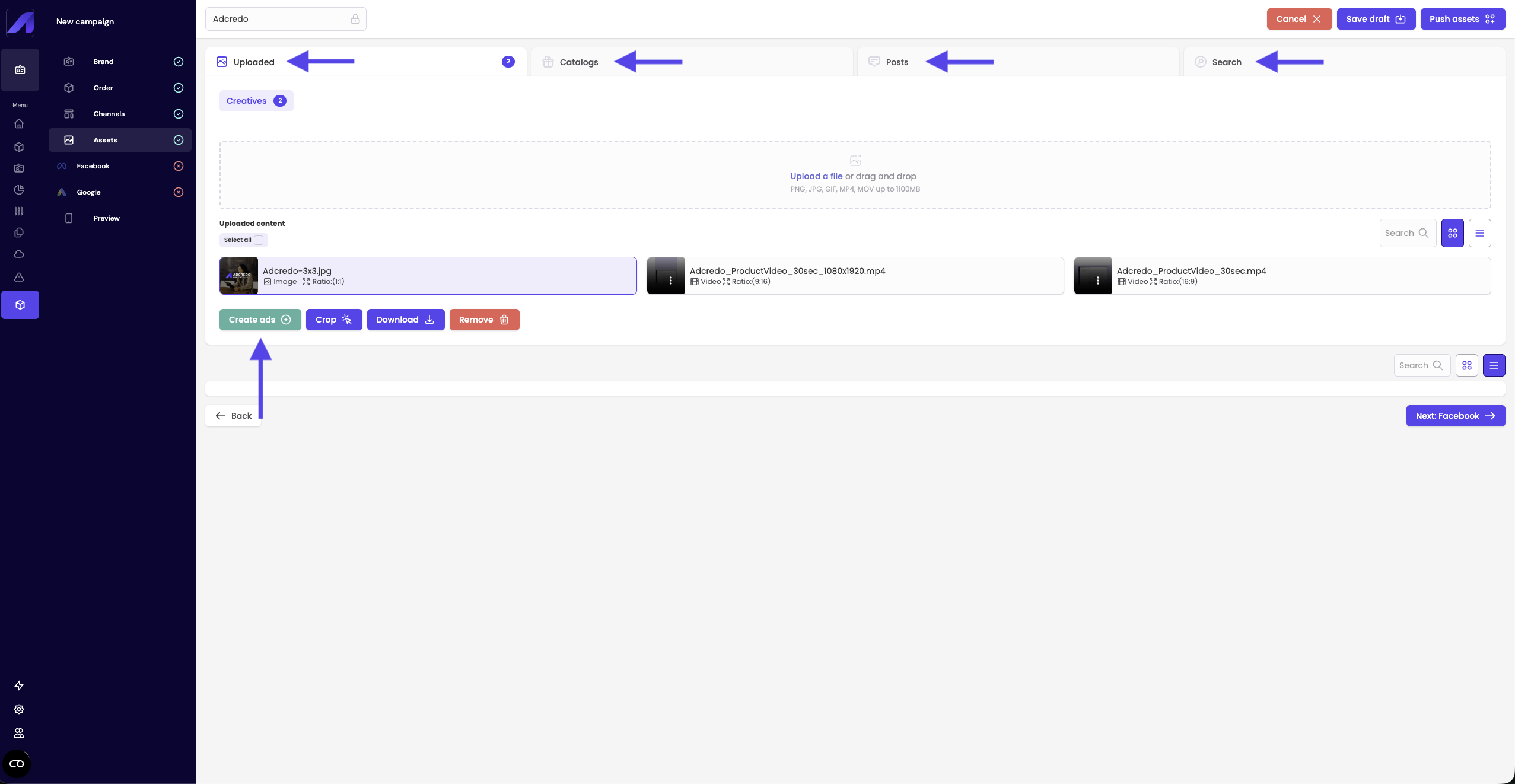 From Uploaded/Posts you can click Create ads to move into the Ad builder.