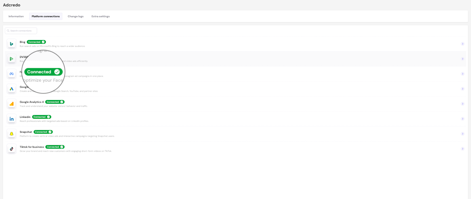 The Platform Connections view is where you connect your platform accounts (Ad accounts or analytics accounts etc.) from different marketing platforms to a specific Brand inside Adcredo.