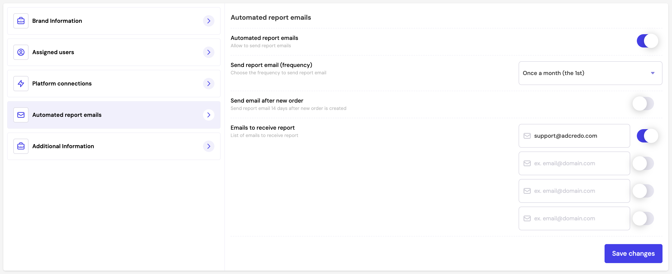 Automated report emails (found under Brand settings) allow you to schedule and send reporting by email based on a recurring time frequency.