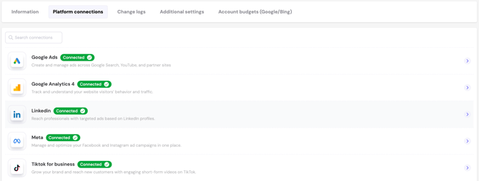 Platform connections appears both in the Information tab and as a separate main tab within the Brand settings view. Both options take you to the same place where you manage connected accounts for your Brand.